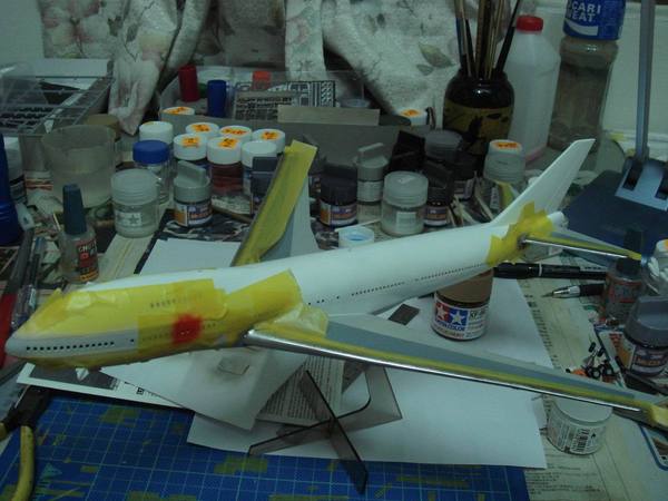 其實不太喜歡民航機(呵呵,因為感覺每一架都長的差不多),當初是因為它的塗裝蠻特殊的才買的,聽說那塗裝是台灣一位小學生的作品哦!!!製作中的情形,東遮遮,西遮遮的